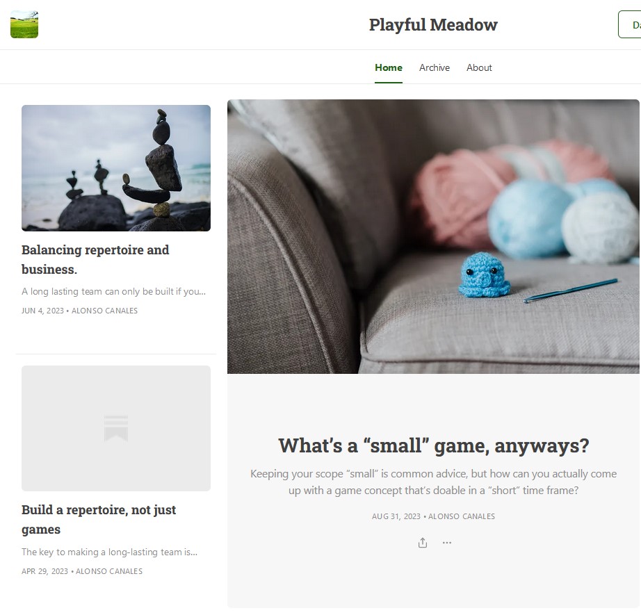Playful Meadow is a newsletter about working smarter, not harder, in game development and business. It was born on the intersection of my experience as a founder of an indie studio who spends a lot of time thinking about how to run studio more effectively and the books on productivity/entrepreneurship I was constantly reading. I had a lot of thoughts I wanted shared but never really had anywhere to write them down.. so I started Playful Meadow!